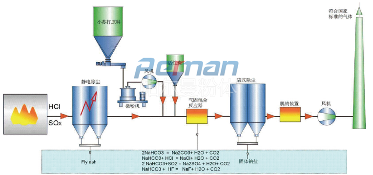 顆粒要求和煙氣中的成分相關,對待SO2和HCl的脫除,其所需的粒徑會有所不同。由于運輸和存儲的原因,碳酸氫鈉原料通常是粗顆粒(d50值約為200微米)。如要達到較高的反應活性,吸附劑必須有較大的比表面積。因此在注入煙氣管道前,碳酸氫鈉必須研磨至一定細度。比如,要去除SO2碳酸氫鈉細度須達到d90 < 20 μm。而去除HCl只要求d90 < 35 μm。如果系統操作正確,可以去除95%以上的SO2;HCl的去除率甚至可達 99%。為了在長期操作中保持所需的碳酸氫鈉細度,通常采用空氣研磨機研磨后,吸附劑以氣體輸送方式運輸并通過多個噴嘴直接通入煙氣管道,以保證其在管道內均勻分散。這套設備設計簡單耐用,與其它煙氣凈化方式相比,它的投資和運營成本均較低。