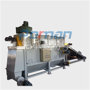 篩分裝置:篩分裝置中滾筒篩壁面布滿篩孔,篩板表面固定有可活動的6塊斜板,此斜板起到內螺旋的作用。廢袋和物料進入滾筒篩內,滾筒篩低速旋轉,加速物料透過篩孔落入錐斗內,廢袋由滾筒篩內螺旋輸送到滾筒出口,并掉落到廢袋輸送機內。