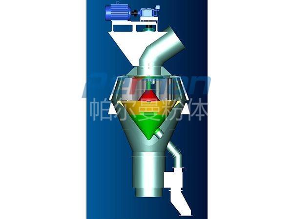 氣流分級機與旋風分離器、除塵器、引風機組成一套分級系統。物料在風機抽力作用下由分級機下端入料口隨上升氣流高速運動至分級區,在高速旋轉的分級渦輪產生的強大離心力作用下,使粗細物料分離,符合粒徑要求的細顆粒通過分級輪葉片間隙進入旋風分離器或除塵器收集,粗顆粒夾帶部分細顆粒撞壁后速度消失,沿筒壁下降至二次風口處,經二次風的強烈淘洗作用,使粗細顆粒分離,細顆粒上升至分級區二次分級,粗顆粒下降至卸料口處排出。● 適用于干法微米級產品的精細分級,可分級球狀、片狀、針狀的顆粒,也可對不同密度的顆粒進行分級。